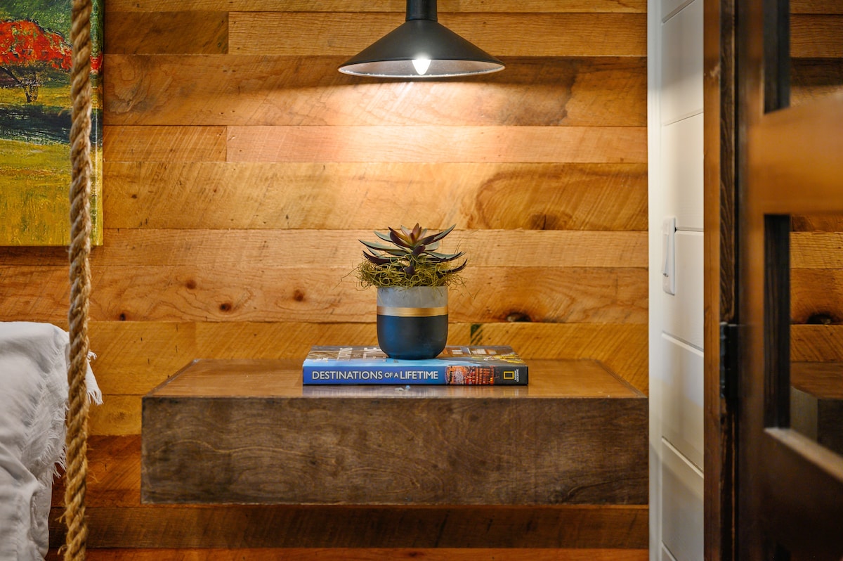 Just around the corner you’ll find a suspended king size bed, complete with luxury linens while simultaneously anchored to the floor for stability. A walk-in closet is built in with luggage racks and has hangers for date-night apparel.